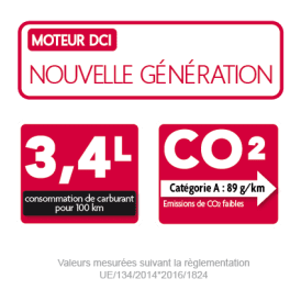Con un consumo di 3,4 litri per 100 chilometri*, emette solo 89g di CO²/km* ed è anche il motore più economico per la manutenzione. Discreto, si distingue per la sua silenziosità, la fluidità in accelerazione e il basso livello di emissioni sonore. La gestione elettronica riduce i fumi, mentre la pre-iniezione attenua il rumore di combustione. Bicilindrico raffreddato a liquido, questo motore di 480 cm3 è stato concepito per la massima comodità di utilizzo, il minimo livello sonoro e vibrazioni ridotte.